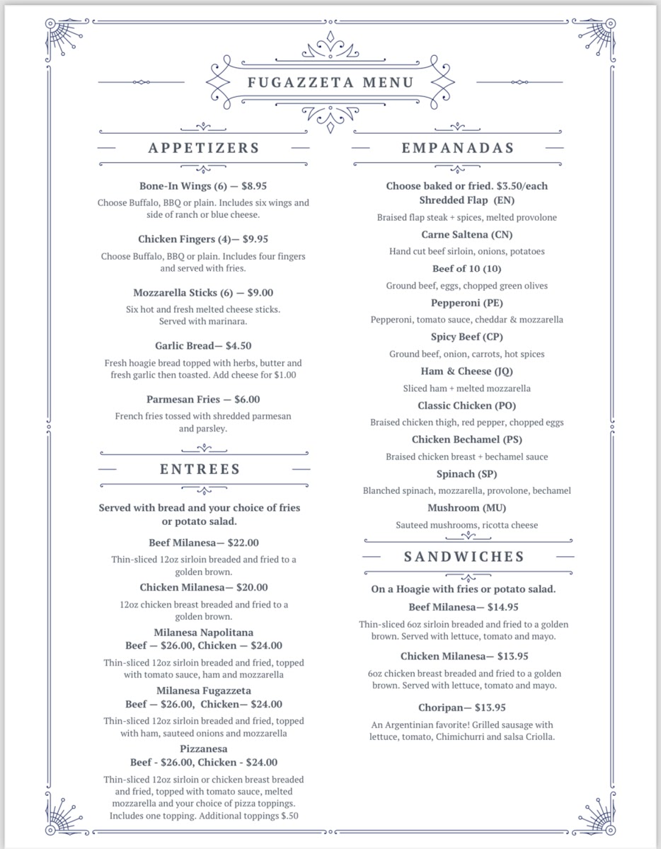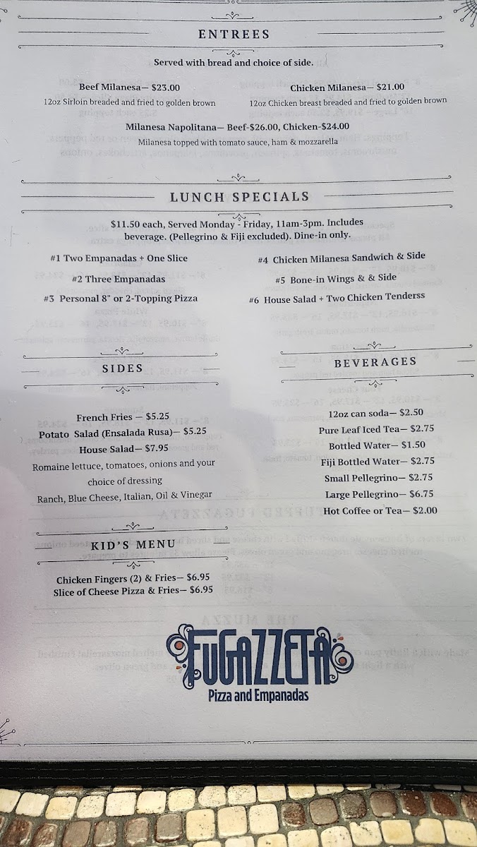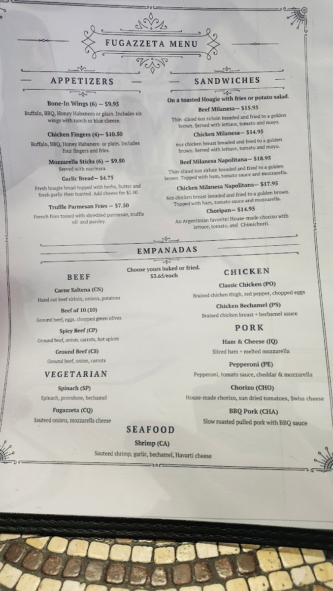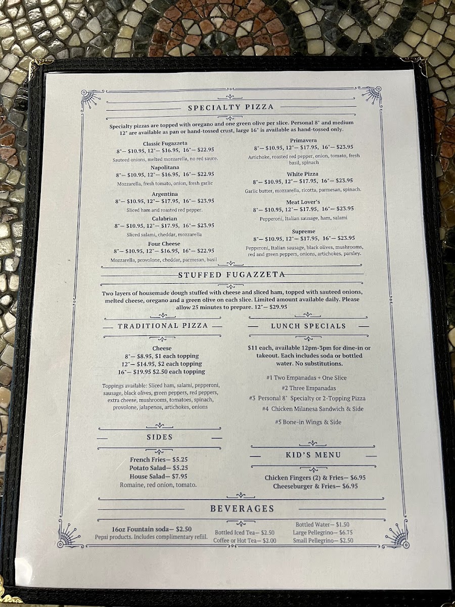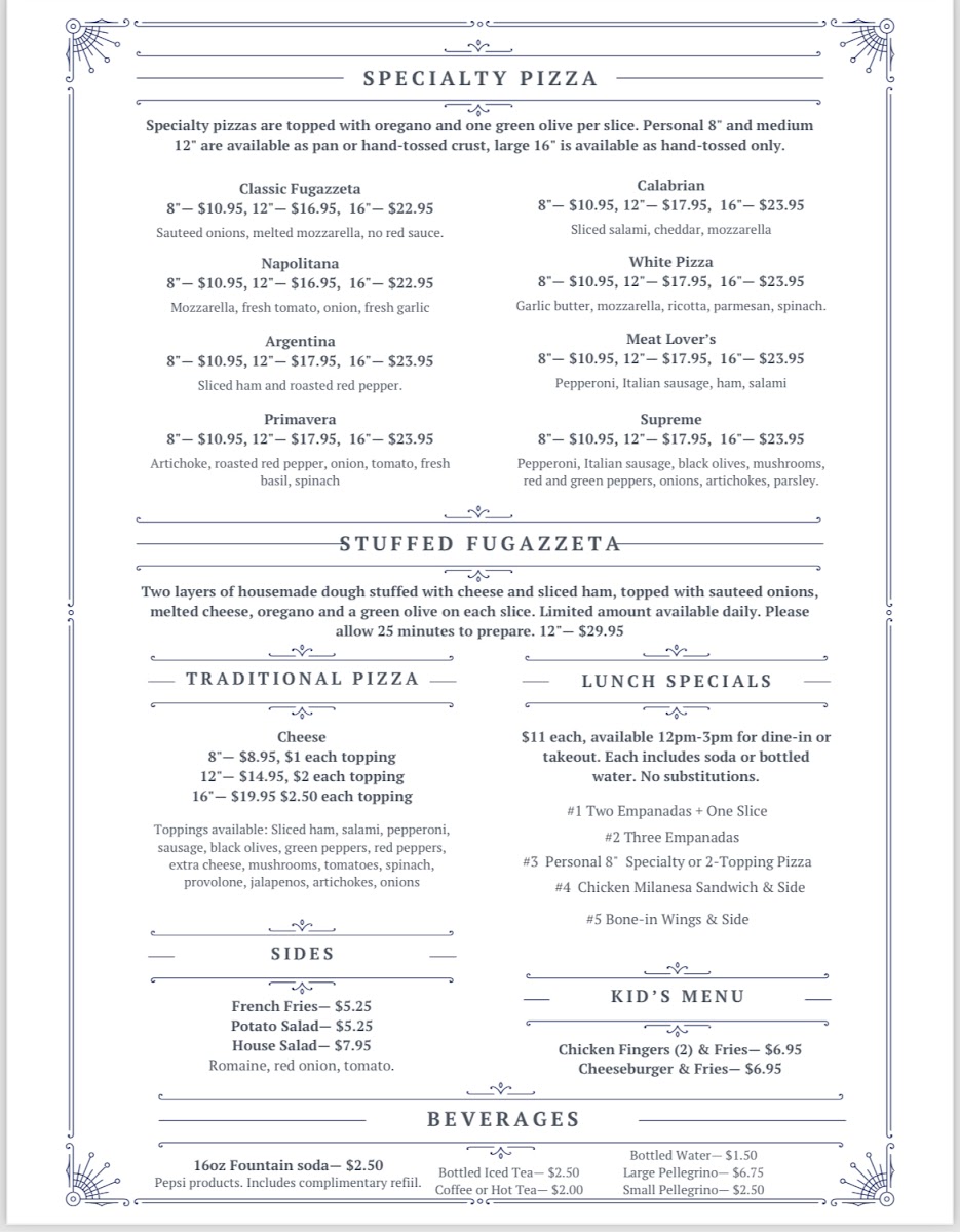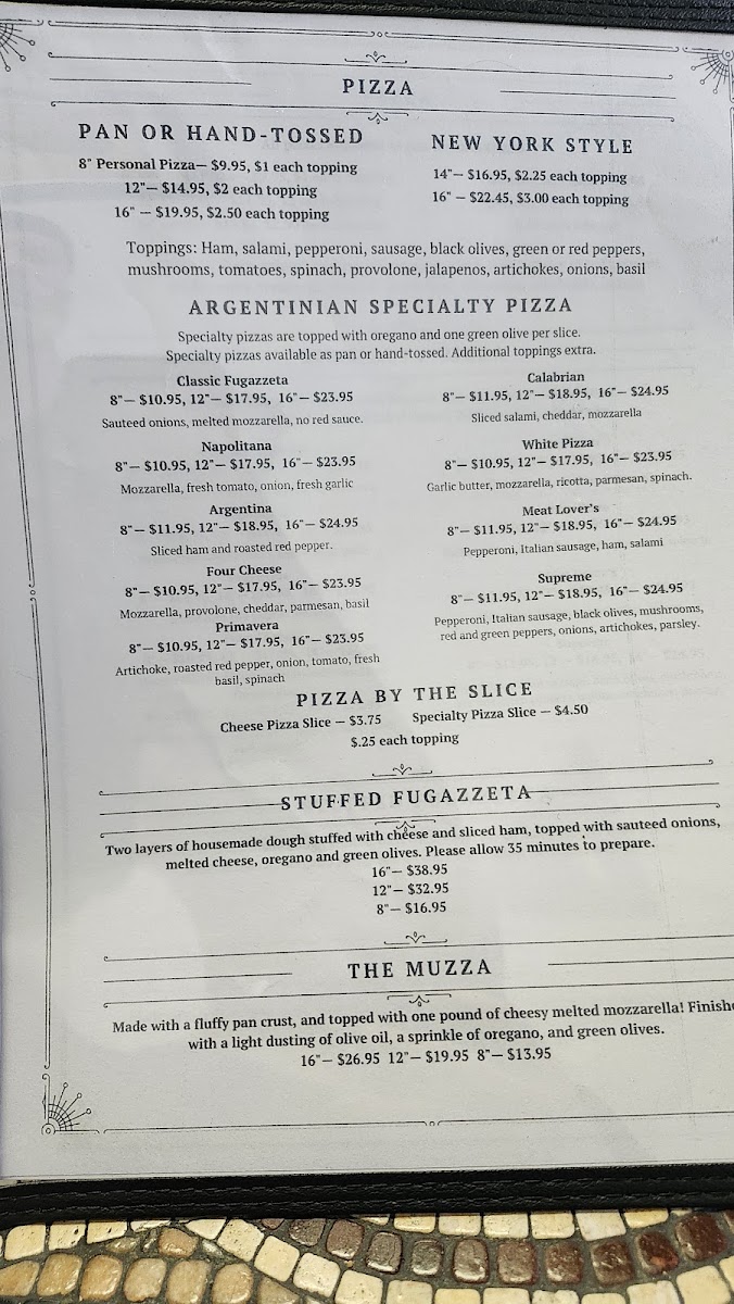 Housemade dough stuffed with cheese and ham, then another layer of fresh dough topped with sauteed onions and cheese. Topped with a sprinkle of oregano and a green olive on each slice.