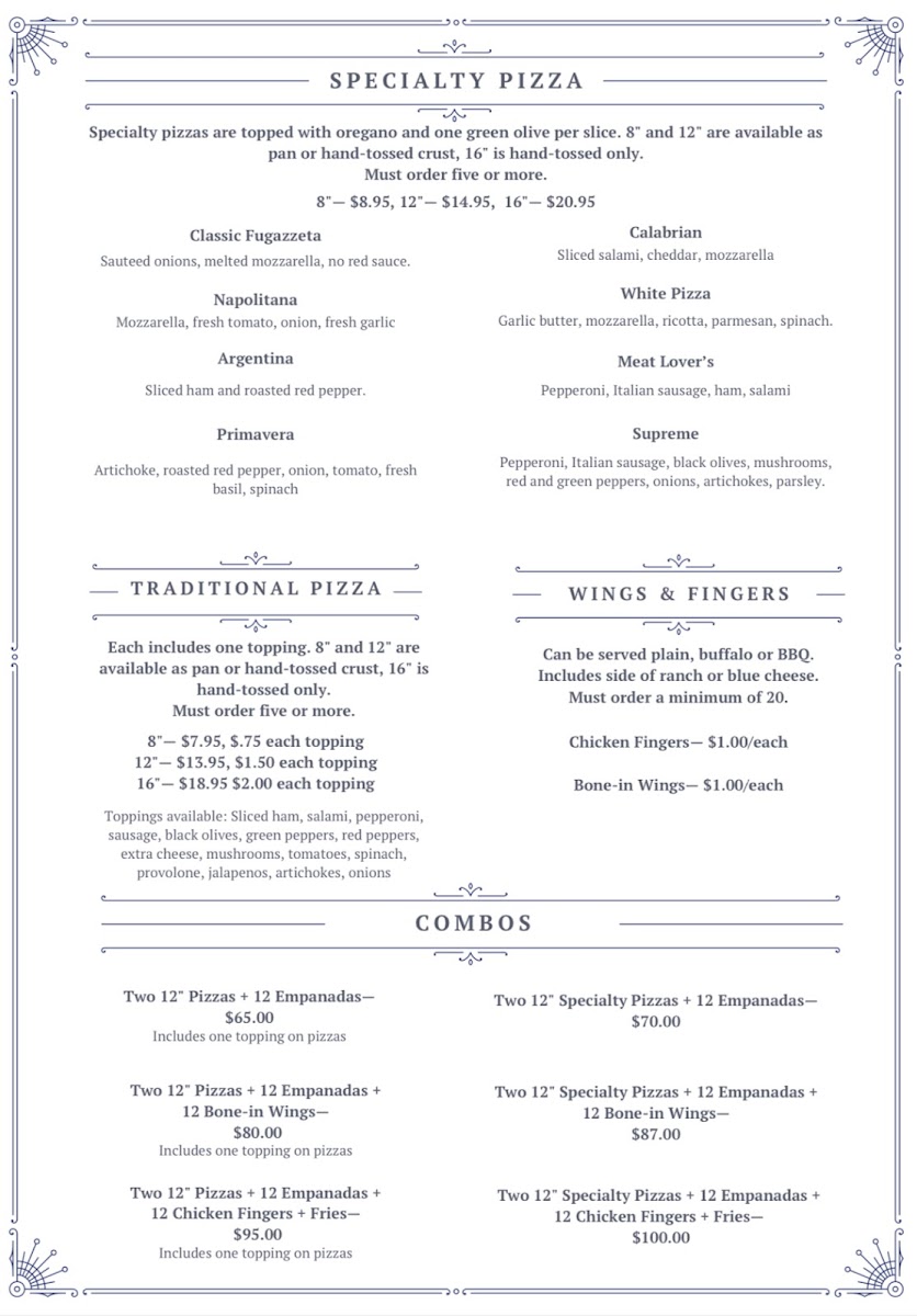Two layers of housemade dough stuffed with cheese and sliced ham, topped with sauteed onions, melted cheese, oregano and green olives. Please allow 35 minutes to prepare.